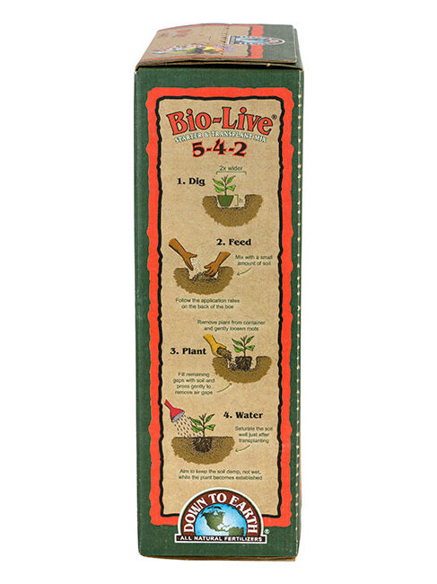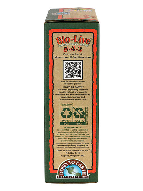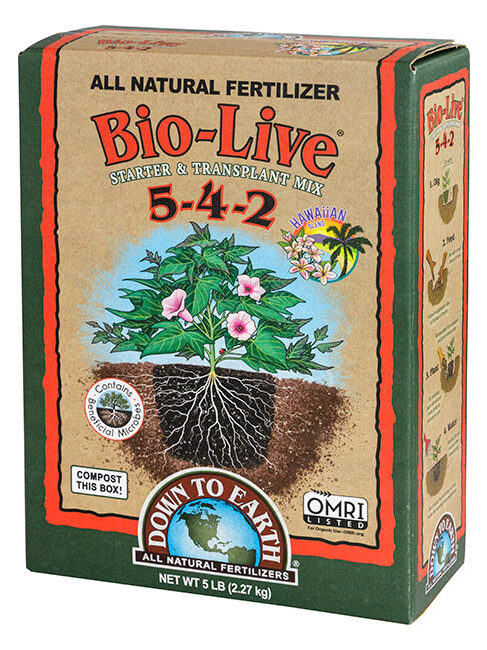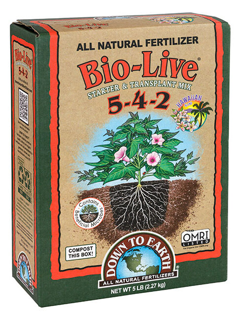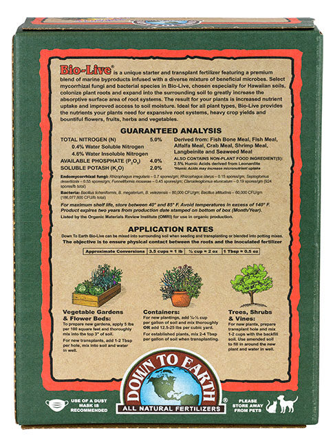 Down To Earth’s Bio-Live 5-4-2 is a unique starter and transplant fertilizer featuring a premium blend of marine byproducts infused with a diverse mixture of beneficial microbes. Select mycorrhizal fungi and bacterial species in Bio-Live, chosen especially for Hawaiian soils, colonize plant roots and expand into the surrounding soil to greatly increase the absorptive surface area of root systems. The result for your plants is increased nutrient uptake and improved access to soil moisture. Ideal for all plant types, Bio-Live provides the nutrients your plants need for expansive root systems, heavy crop yields and bountiful flowers, fruits, herbs and vegetables.