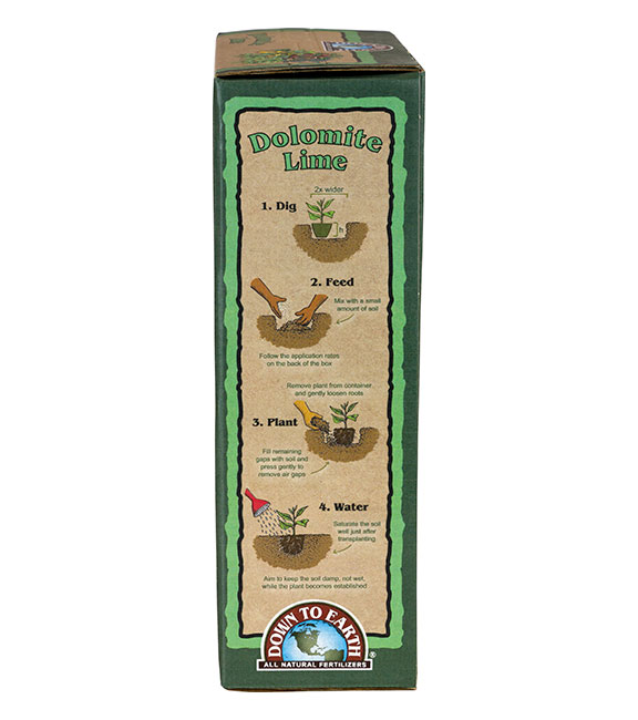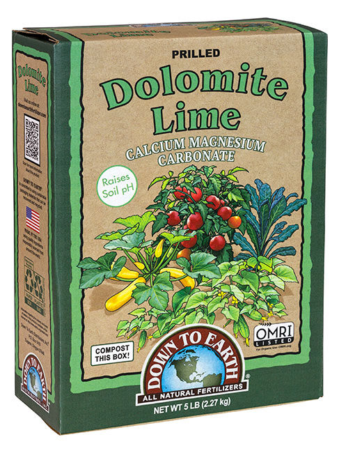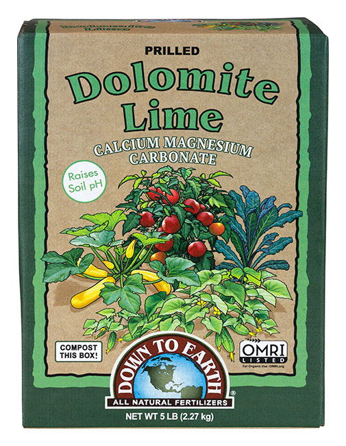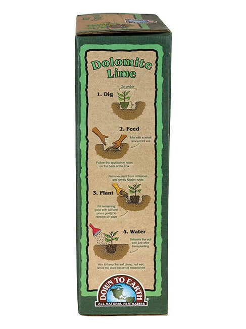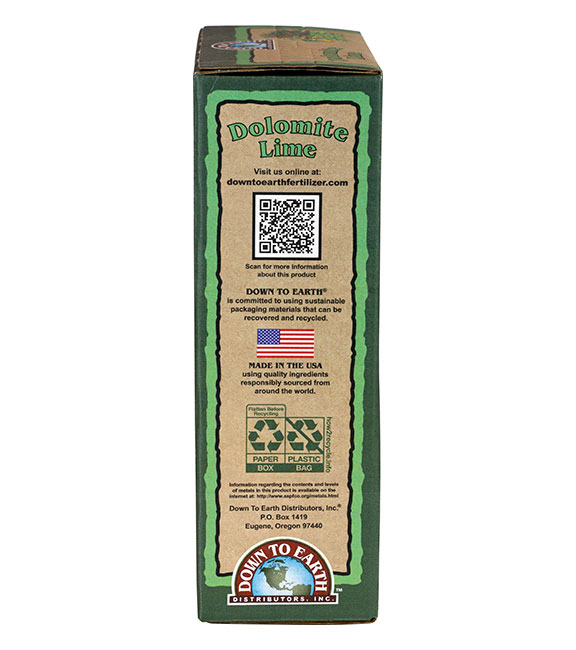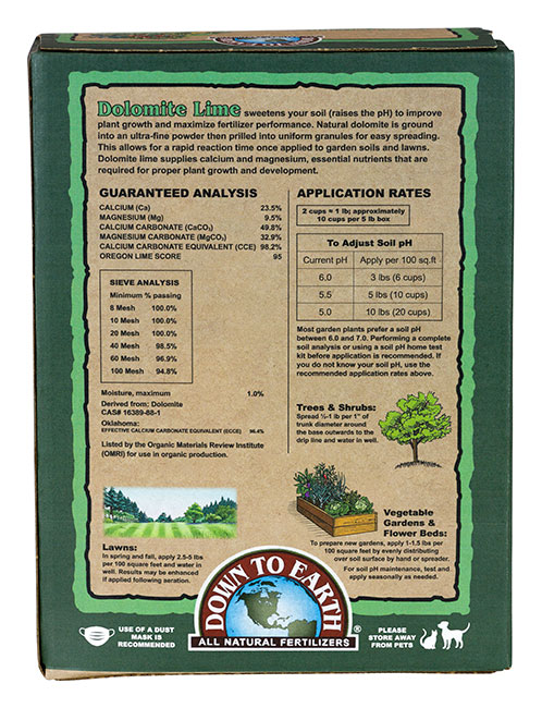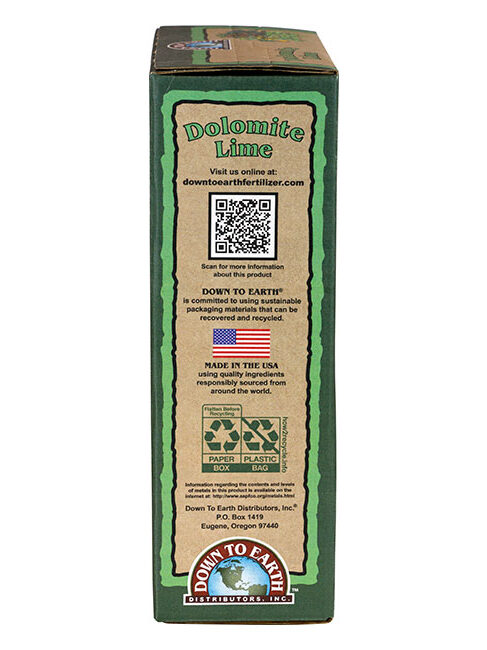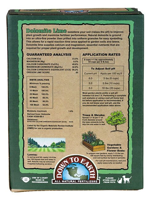 Down To Earth’s Dolomite Lime sweetens your soil (raises the pH) to improve plant growth and maximize fertilizer performance. Natural dolomite is ground into an ultra-fine powder then prilled into uniform granules for easy spreading. This allows for a rapid reaction time once applied to garden soils and lawns. Dolomite lime supplies calcium and magnesium, essential nutrients that are required for proper plant growth and development.