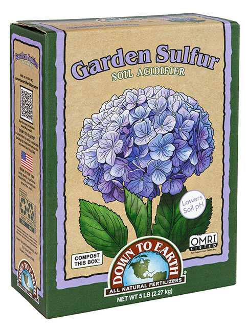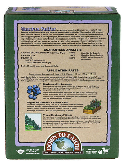 Garden Sulfur is a valuable amendment that can lower soil pH, help improve soil characteristics, and enhance plant nutrient availability. When dealing with problem soils, such as alkaline or saline soil, it is important to address the conditions that are negatively affecting plant growth. If your hydrangeas, blueberries or evergreens aren’t performing up to expectations, unsuitable soil pH may be the root cause. Alkaline soils (pH > 7.5) can cause nutrient deficiencies which may appear as stunted growth, yellow leaves, or other physical symptoms. Garden Sulfur contains two essential plant nutrients: calcium & sulfur. These nutrients provide numerous benefits and are key to myriad natural chemical and biological processes in soil and plants.