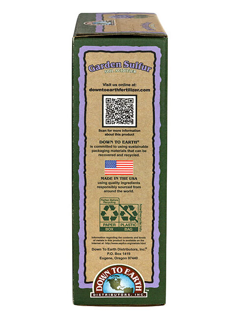 For established plants, apply 1 cup Garden Sulfur per 1 inch of trunk diameter evenly to soil outwards towards the drip line. Cover with fresh soil, compost or mulch and water in well. For soil pH maintenance, test and apply seasonally as needed.