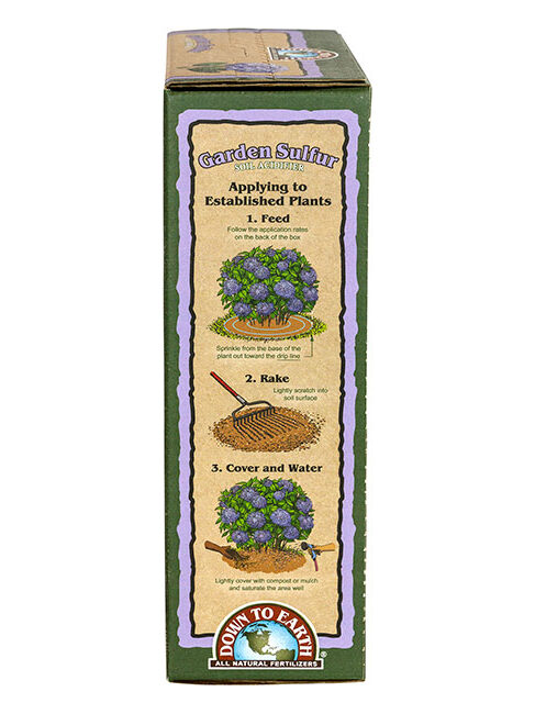 Apply Garden Sulfur in the spring and summer to lower soil pH. Most acid loving plants prefer a soil pH between 4.5 and 6.5. Performing a complete soil analysis (with lab recommendations) or using a soil pH home test kit before application is encouraged. If you do not know your soil pH, use the recommended application rates below: