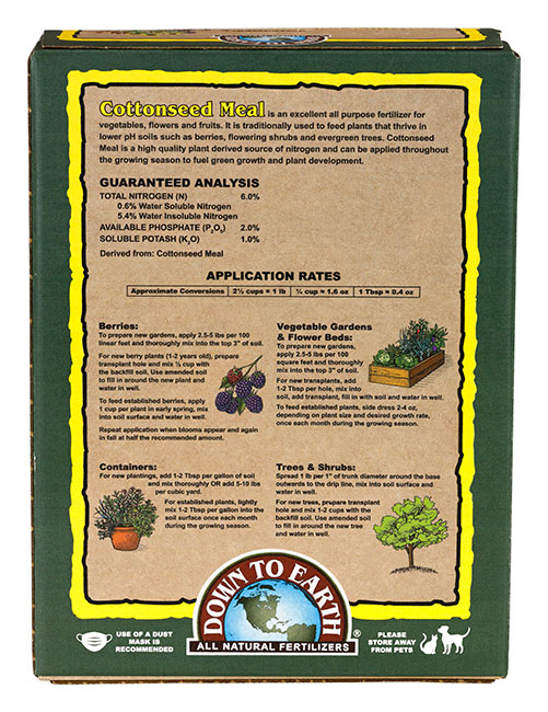 Down To Earth’s Cottonseed Meal 6-2-1 is traditionally used to feed plants that thrive in lower pH soils, such as berries, flowering shrubs and evergreen trees. DTE Cottonseed Meal 6-2-1 is a high-quality plant derived source of nitrogen and can be applied throughout the growing season to promote green growth and optimum plant development.