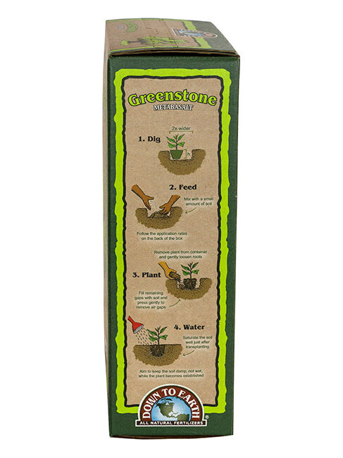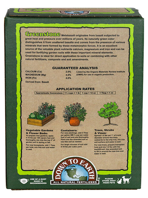 Greenstone Metabasalt originates from basalt subjected to great heat and pressure over millions of years. Its naturally green color distinguishes it from unaltered basalts and comes from the presence of various minerals that were formed by these metamorphic forces. It is an excellent source of the valuable plant nutrients calcium, magnesium and iron and can be used for fortifying garden soils with these important mineral elements. Greenstone is ideal for direct application to soils or combining with other natural fertilizers, composts and soil amendments.